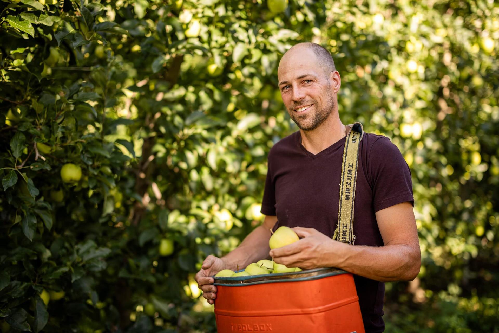 In Oberplars oberhalb von Algund bewirtschaftet Matthias Gamper seinen Hof in sonniger Lage auf rund 600 Metern Meereshöhe. Die Kombination aus viel Sonne, kühlen Nächten im Herbst und guter Luft schafft ideale Bedingungen für den Apfelanbau in Südtirol.