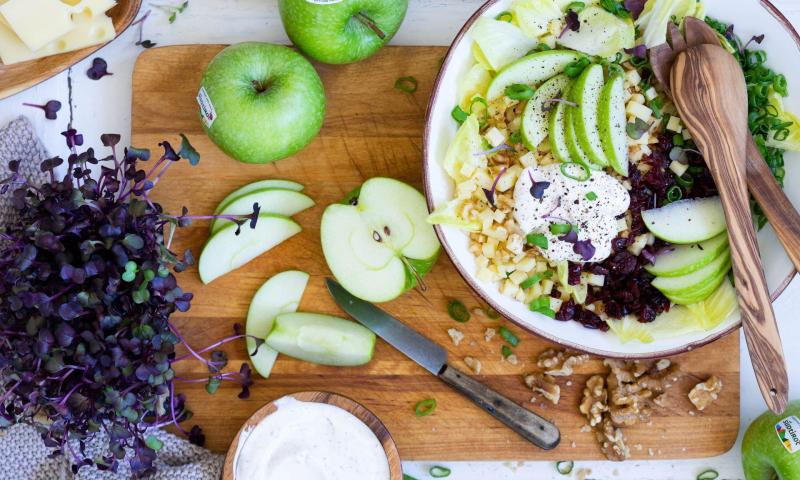 Walnüsse und Cranberries mittel grob hacken. Den Käse in kleine Würfel schneiden. Den Chicorée vom Strunk befreien und in mundgerechte Stücke zerkleinern. Frühlingszwiebel-Grün waschen und in feine Ringe schneiden. Die Granny Smith-Äpfel waschen, vierteln, Kerngehäuse entfernen und in dünne Spalten schneiden. Alles in einer größeren Schale mit dem Dressing vermengen. Mit frisch gemahlenem Pfeffer abschmecken, etwas frische Rettich-Kresse dazugeben und durchziehen lassen.